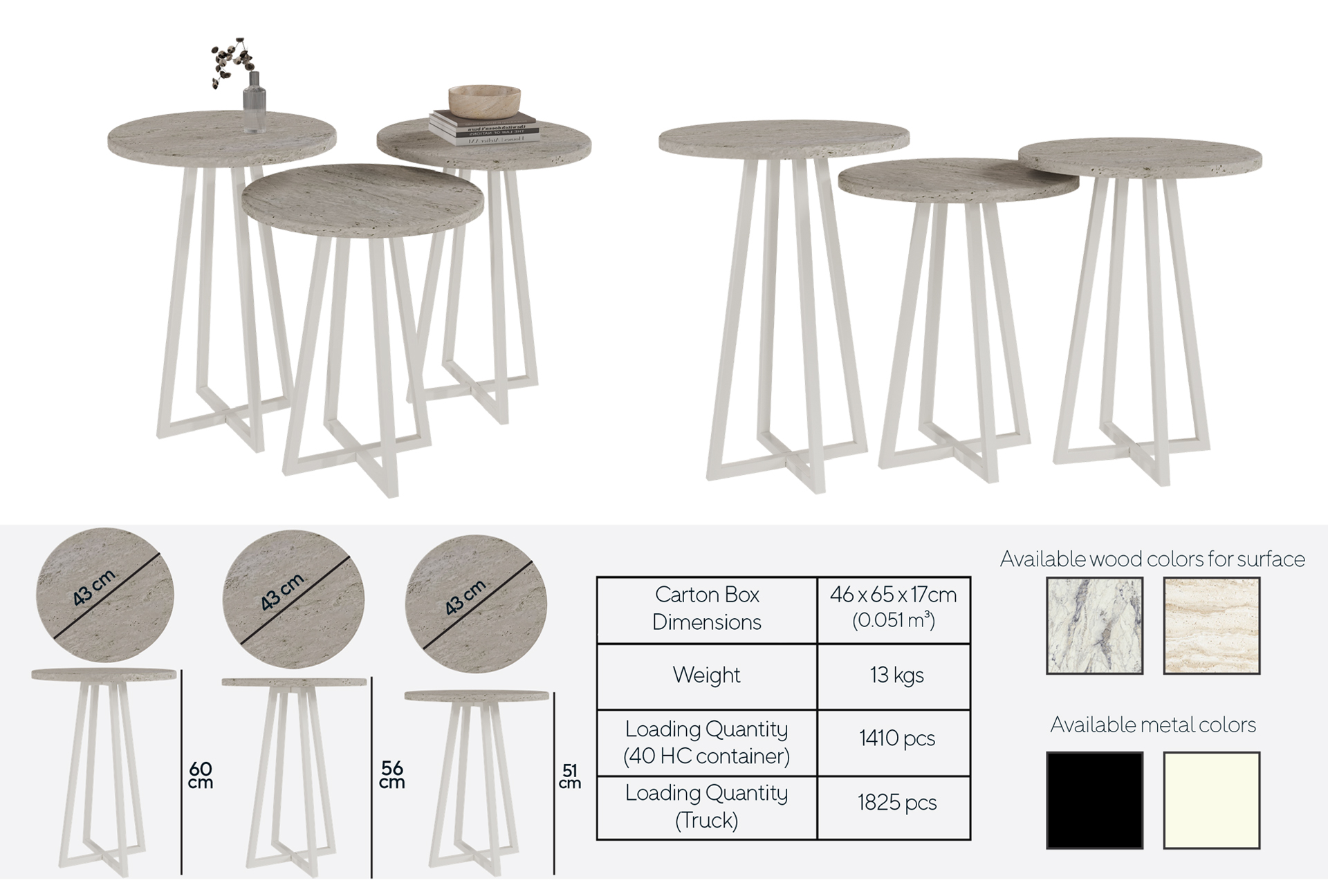 43 cm Ideal Circular Surface: The generous surface width of all three pieces offers an optimized, corner-free safe area for catering services and decorative objects.
