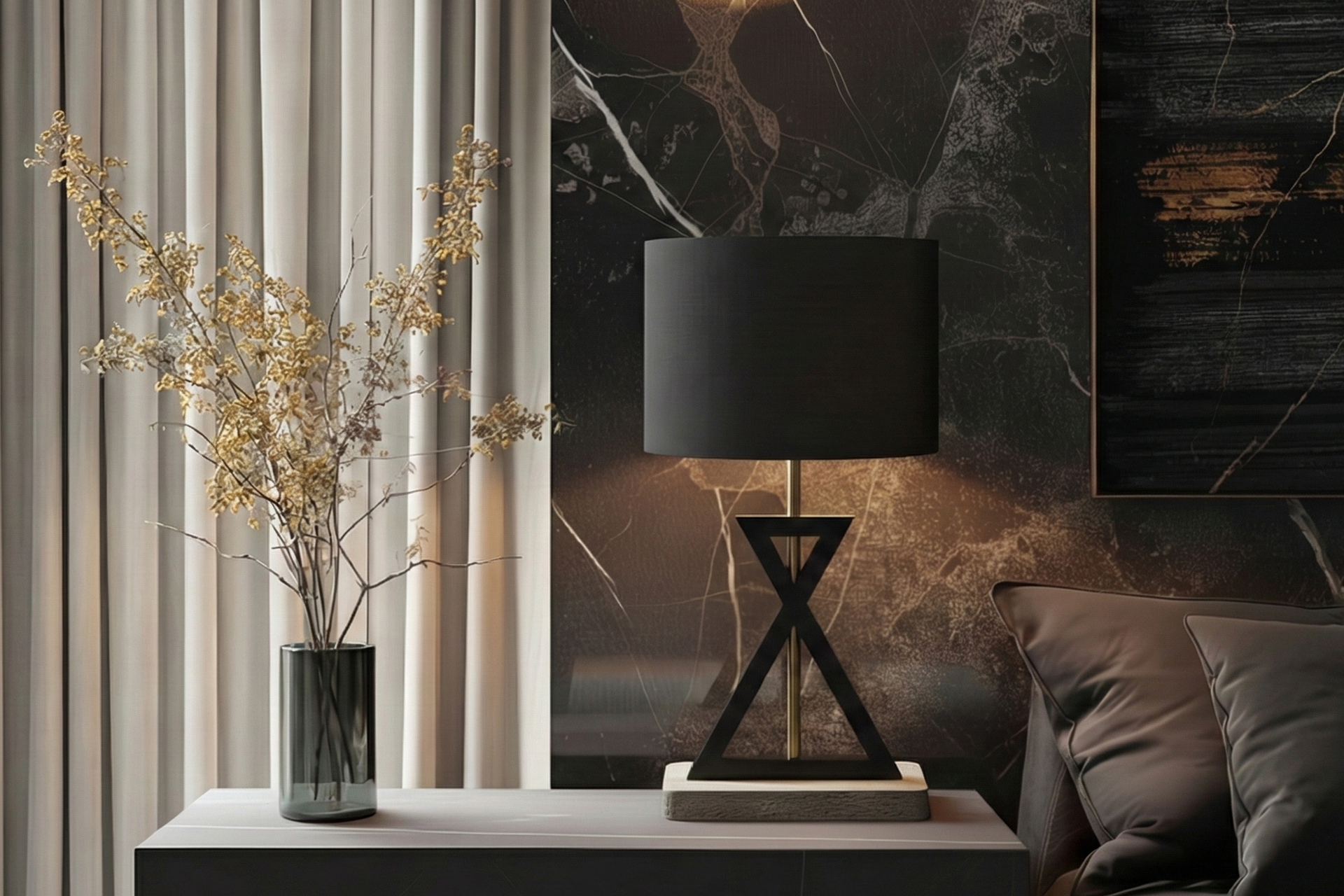 Noble Marble Plinth: The wide marble/travertine base optimizes the lamp’s center of gravity for wobble-free usage while emphasizing the elegance of natural stone.