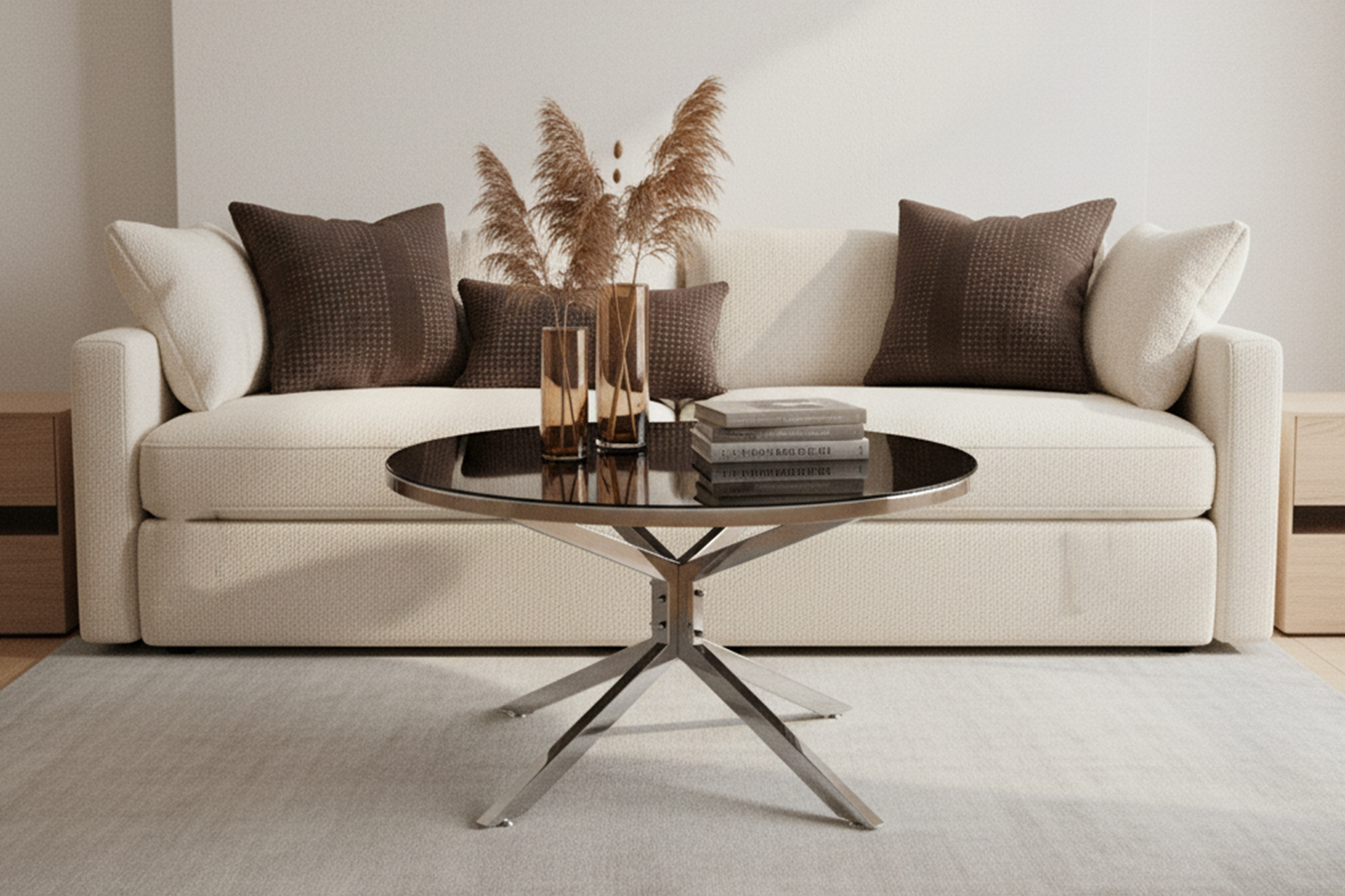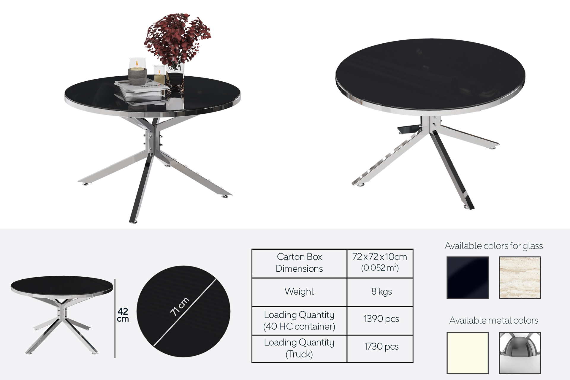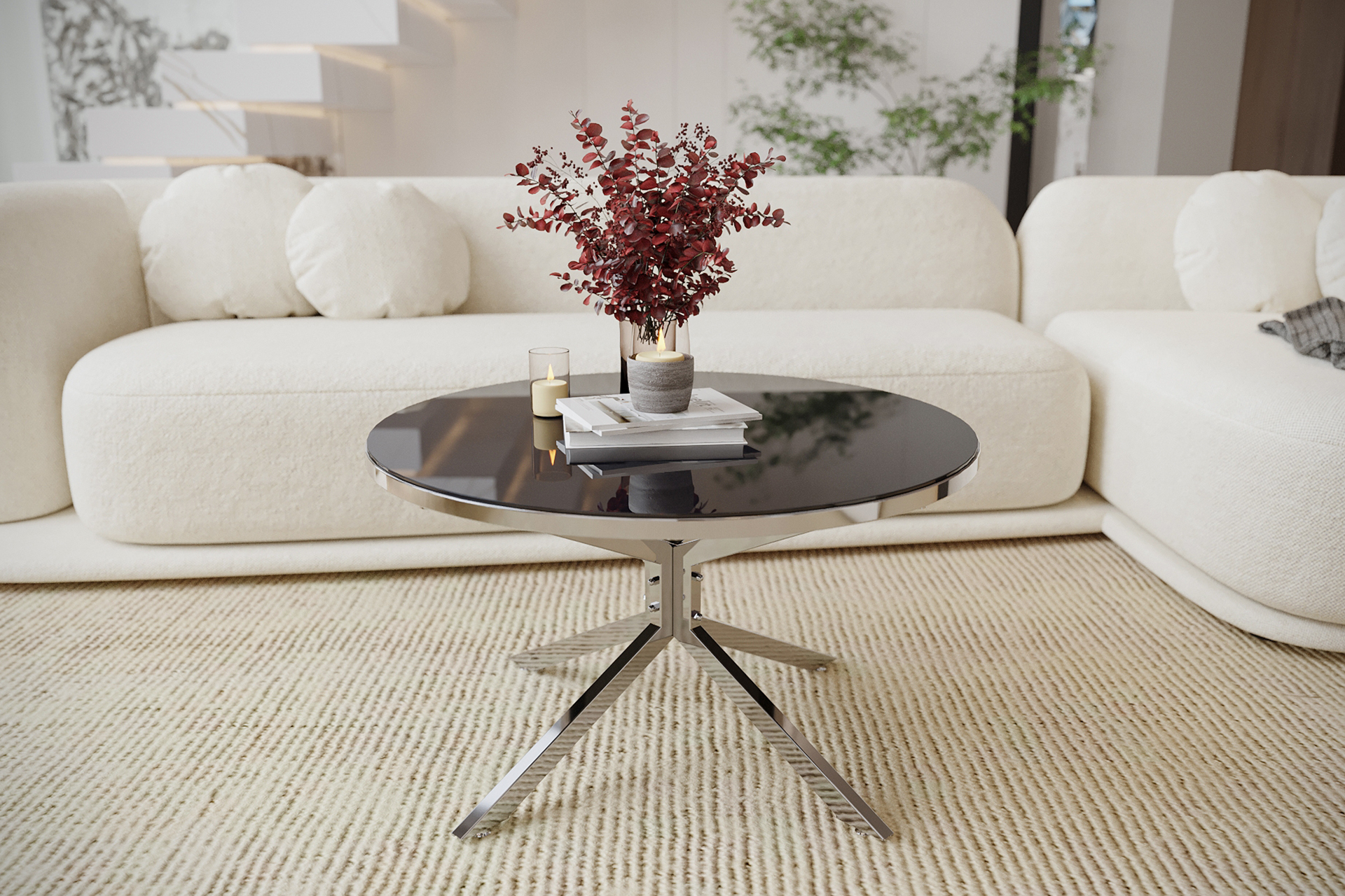 Tempered Smoked Glass Surface: The wide 71 cm diameter top surface is made of heat-treated tempered glass. Its impact-resistant structure and reflective smoked texture add a luxury suite atmosphere to the room.