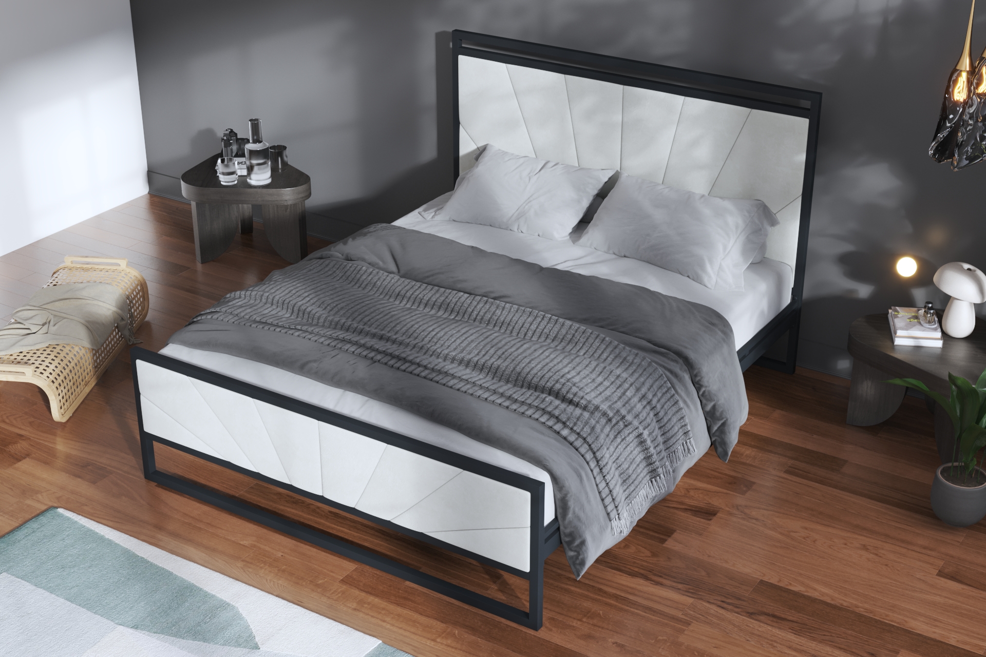 Doka Metal Karyola, metal mobilya tasarımında alışılagelmişin dışına çıkan, güçlü bir karakter sergileyen özel bir modeldir. Hem başlık hem de ayak ucu panellerinde uygulanan, bir merkezden yayılan geometrik dikişli açık gri döşemeler, karyolaya üç boyutlu bir derinlik ve modern bir sanat eseri kimliği kazandırır. Bu tekstil dokunuşu, metalin soğukluğunu kırarak yatak odanızda sıcak ve davetkar bir atmosfer yaratır.