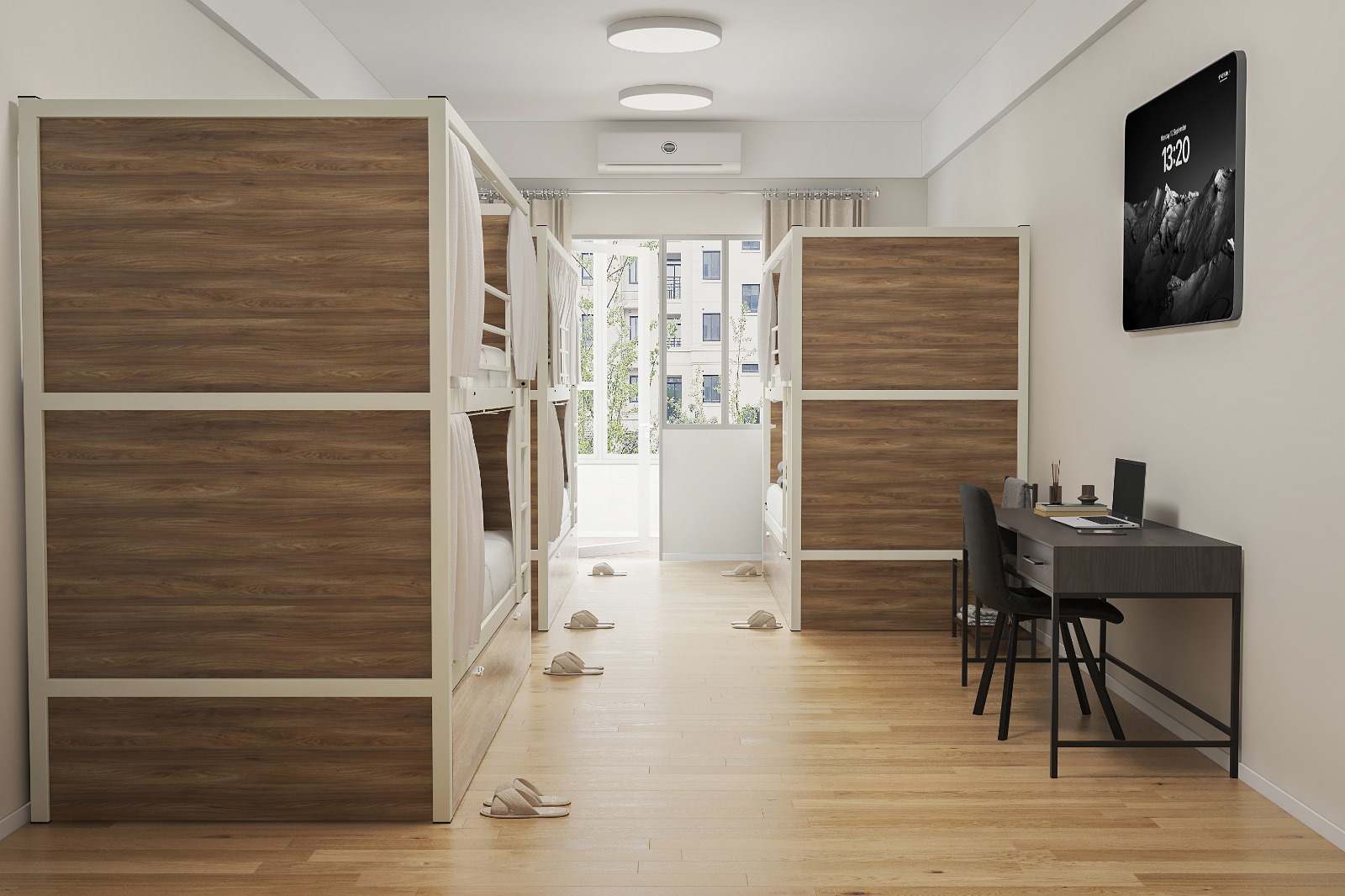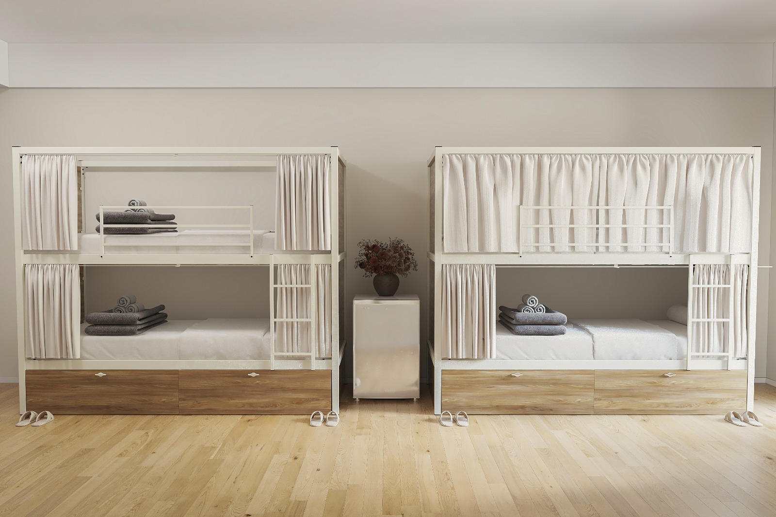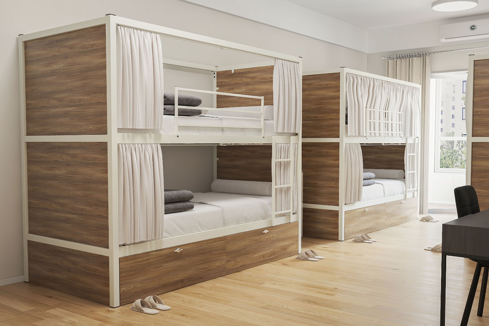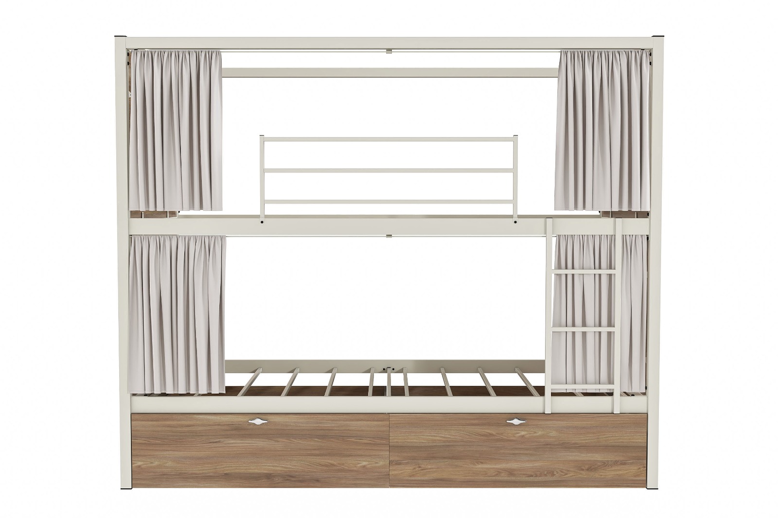 Hostel #2 Metal Ranza, modern paylaşımlı konaklama alanları için tasarlanmış en kapsamlı çözümdür. Bu model, kullanıcıya sadece bir yatak değil; eşyalarını güvenle saklayabileceği geniş bir depolama alanı ve dış dünyadan tamamen izole olabileceği özel bir bölme sunar. Beyaz metal ana iskelet ile sıcak ahşap panellerin uyumu, mekana lüks bir butik otel havası katar.