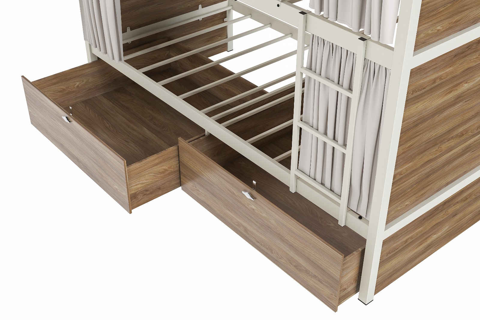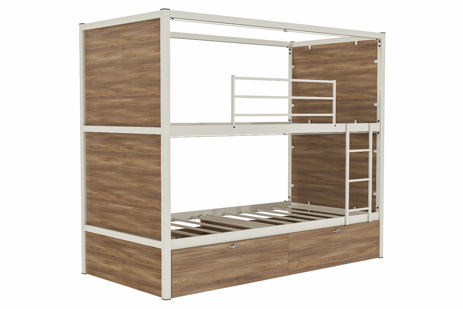 Geniş Alt Çekmeceler: Ranza tabanına tam uyumlu iki adet büyük ahşap çekmece, valizlerden kişisel eşyalara kadar her şeyi düzenli tutar; odadaki ekstra dolap ihtiyacını ortadan kaldırır.