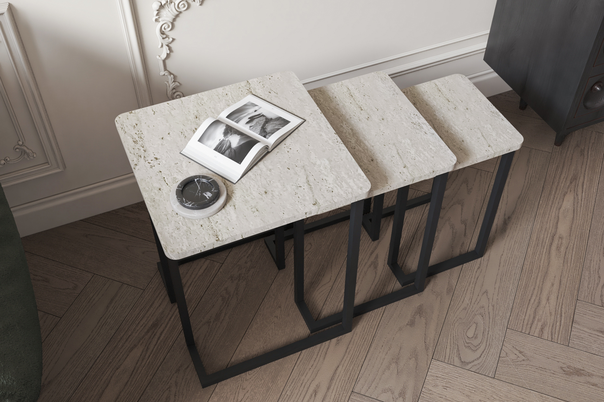 Kovalt Sehpa, sadeliğin gücünü endüstriyel bir estetikle harmanlayarak modern iç mekanlar için çok yönlü bir çözüm sunar. Üç farklı boyut ve yükseklikten oluşan bu kare zigon seti, mermer ve travertenin zamansız dokusunu siyah metalin rijit duruşuyla birleştirir. Özellikle ‘L’ koltuk ve kanepelerle tam uyum sağlayan özel ayak mimarisi, sehpanın size en yakın noktada konumlanmasına olanak tanır.