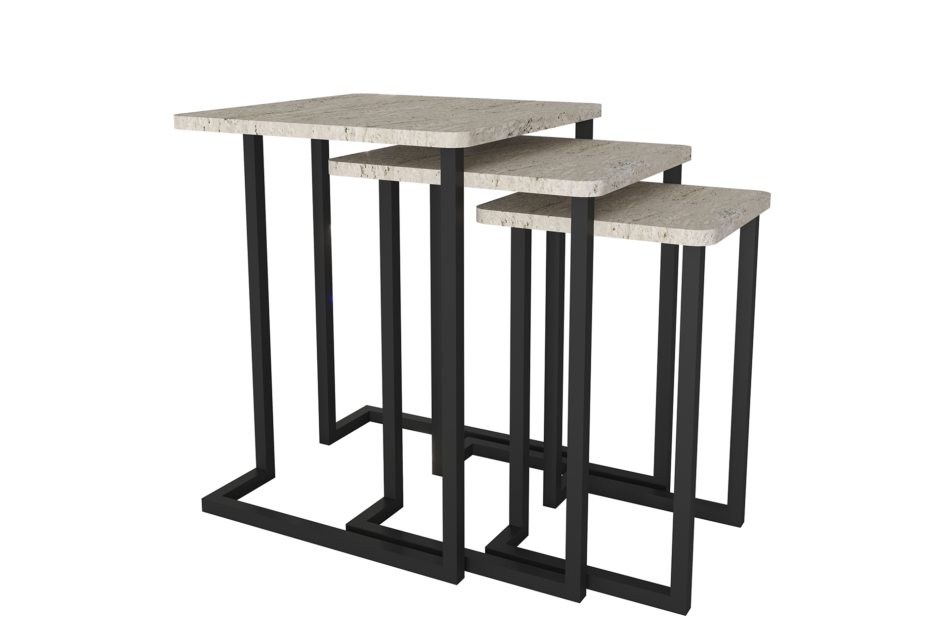 Kompakt Nesting (İç İçe) Yapı: 58 cm, 53 cm ve 48 cm yüksekliklerindeki sehpalar, kullanılmadığında üst üste binerek tek bir ünite kadar yer kaplar.