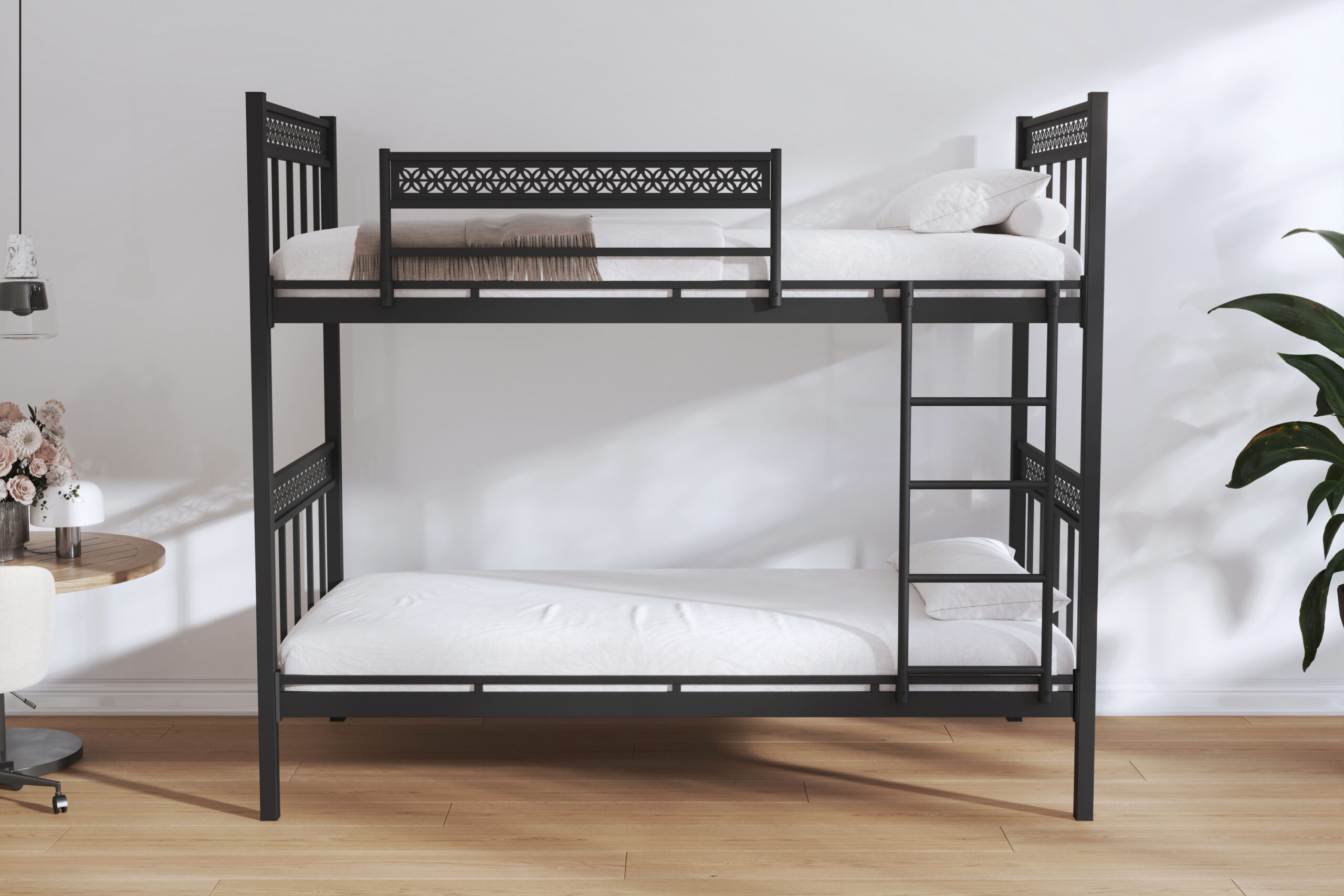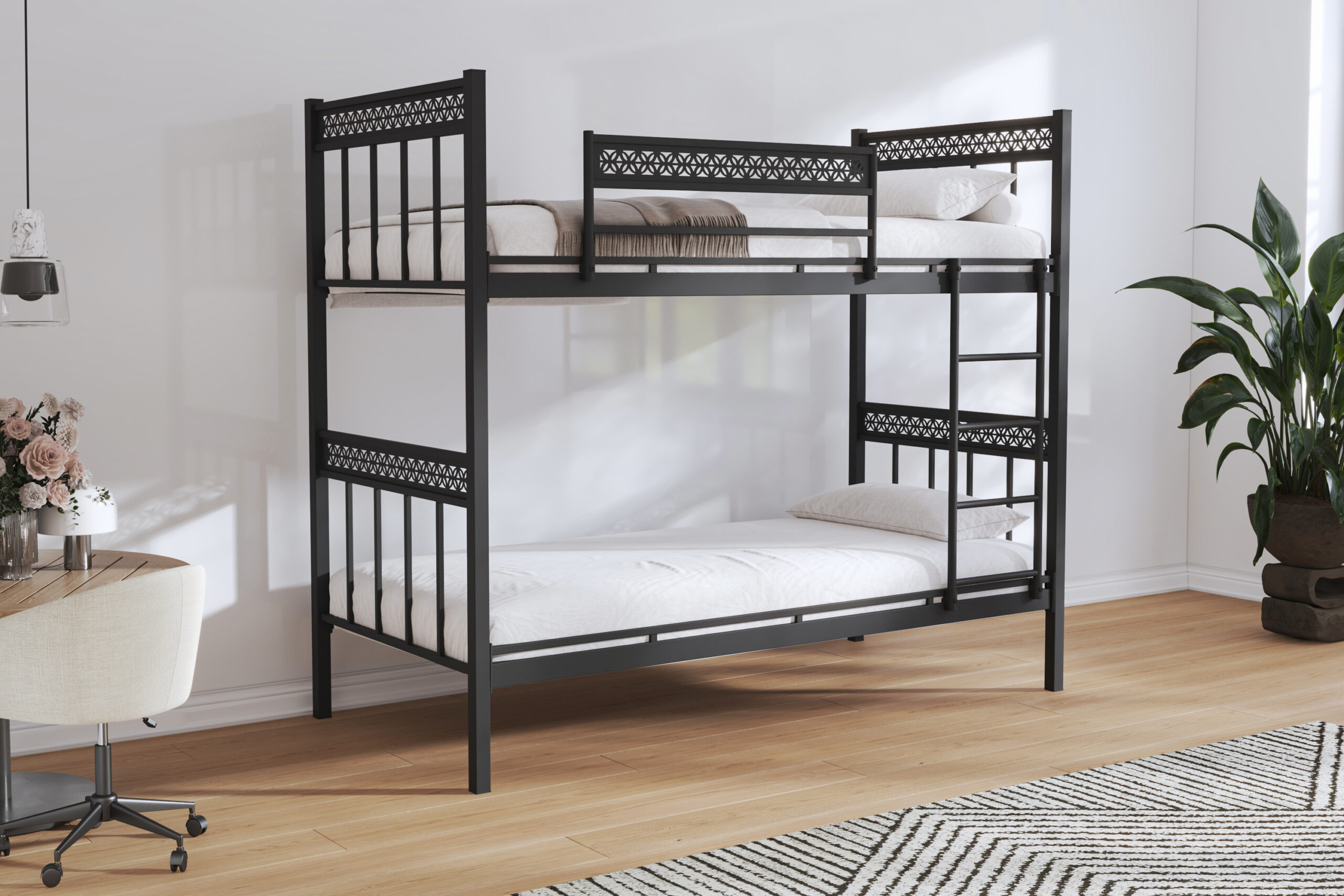 Özel Motifli Bariyerler: Üst katın güvenliğini sağlayan korkuluklar, lazer kesim desenlerle zenginleştirilerek sıradan bir ranza görünümünden tamamen uzaklaşır.