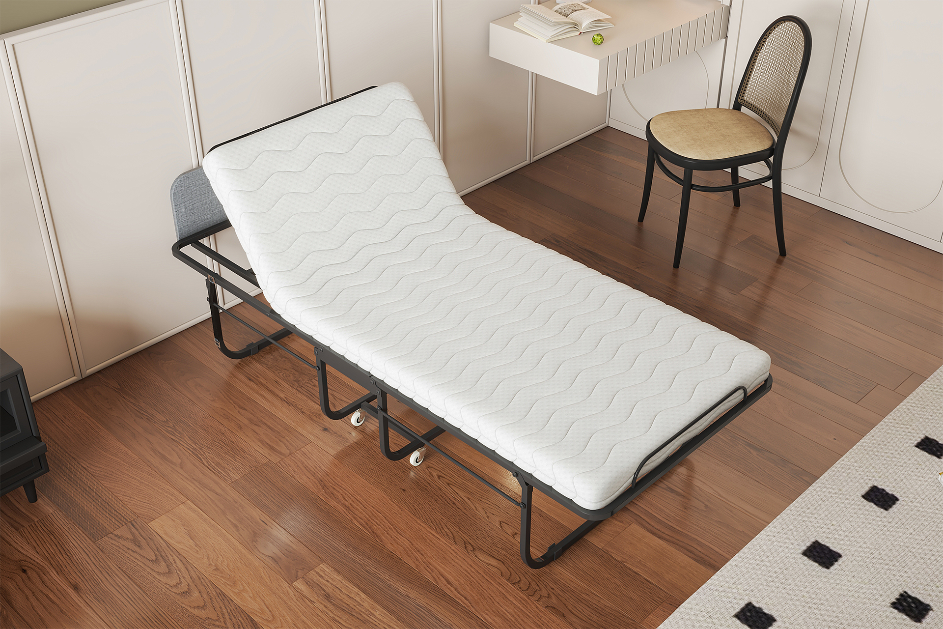 Relax Katlanır Karyola, ismini sunduğu benzersiz dinlenme deneyiminden alır. Koleksiyonun en teknolojik parçalarından biri olan bu model, kademeli olarak yükseltilebilen başlık mekanizması sayesinde kullanıcısına sadece uyuma değil; yatakta kitap okuma, televizyon izleme veya dinlenme imkanı da tanır. Şık gri kumaş başlık döşemesi, metalin sağlamlığını ev sıcaklığıyla birleştirerek estetik bir duruş sergiler.