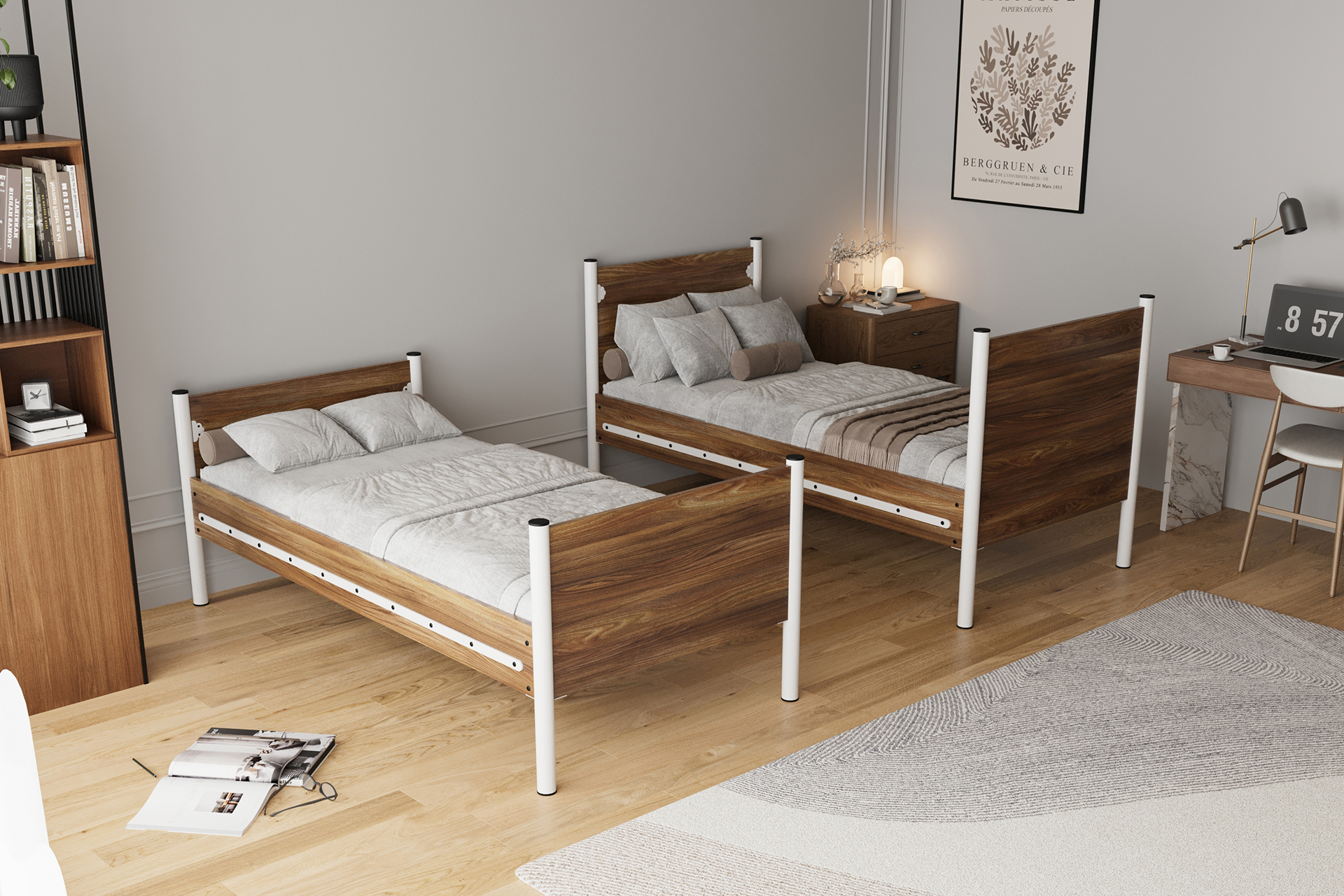 Woodex Metal Ranza, metal mobilya tasarımında ‘doğal yaşam’ konseptini temsil ediyor. Temiz ve ferah bir görünüm sunan beyaz elektrostatik boyalı ana iskelet, hem alt hem de üst katta yer alan geniş, koyu tonlu ahşap panellerle zenginleştirilmiştir. Bu hibrit tasarım, ranzanın endüstriyel algısını tamamen kırarak ona ağır bir mobilya kimliği kazandırır ve her türlü ev dekorasyonuna kusursuz uyum sağlar.